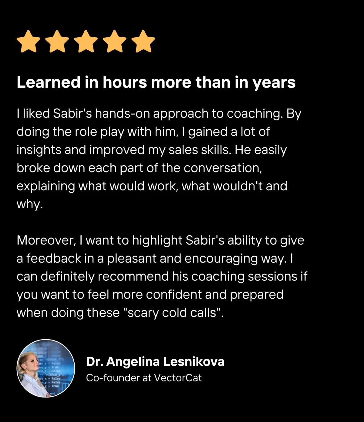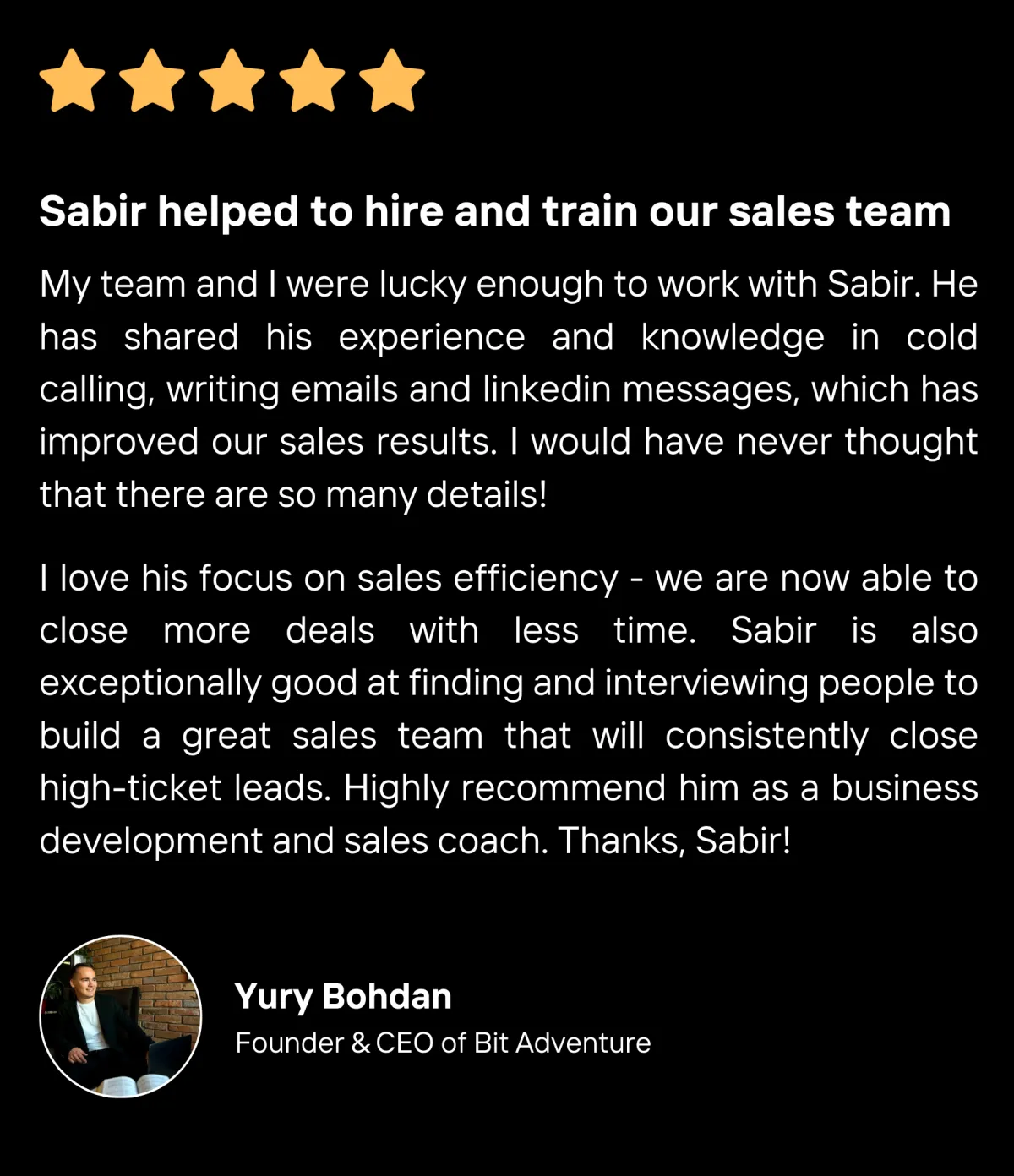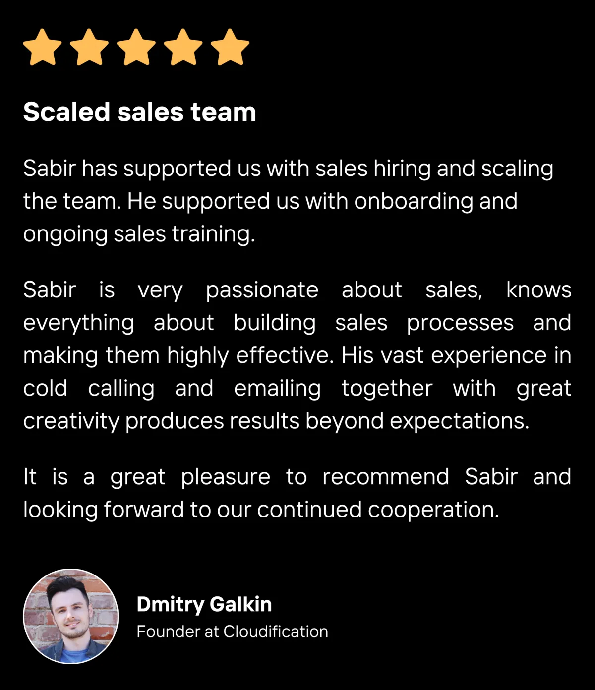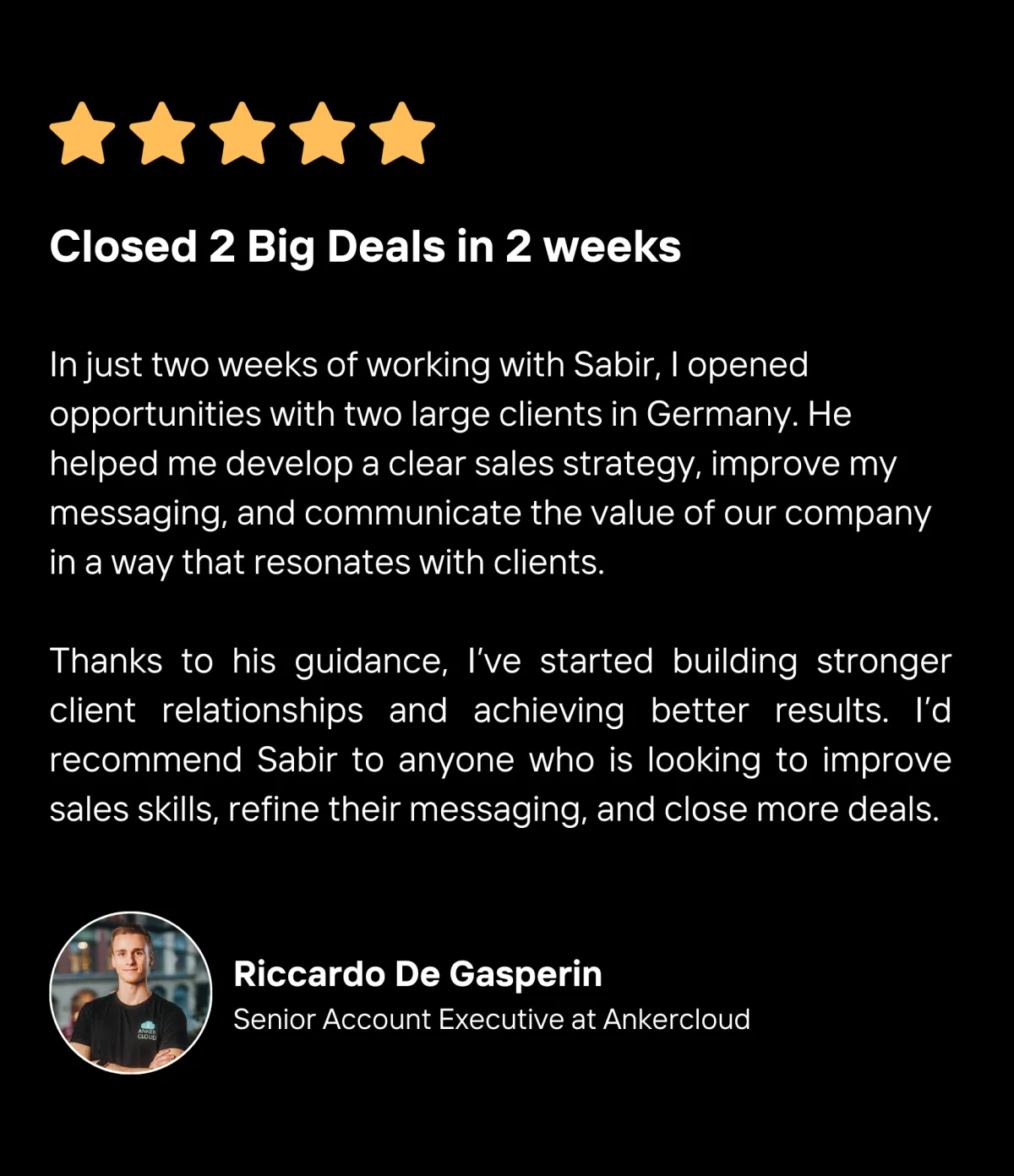 "In just 2 weeks of working with Sabir, I opened opportunities with 2 large clients." [250k EUR total deal size]